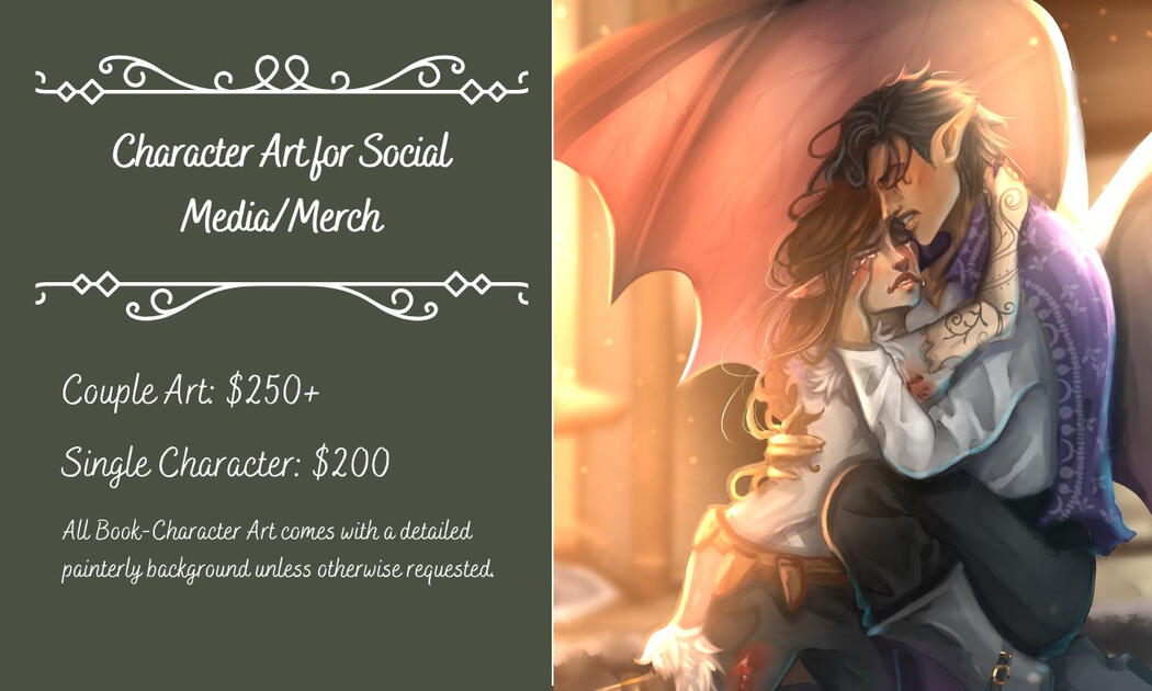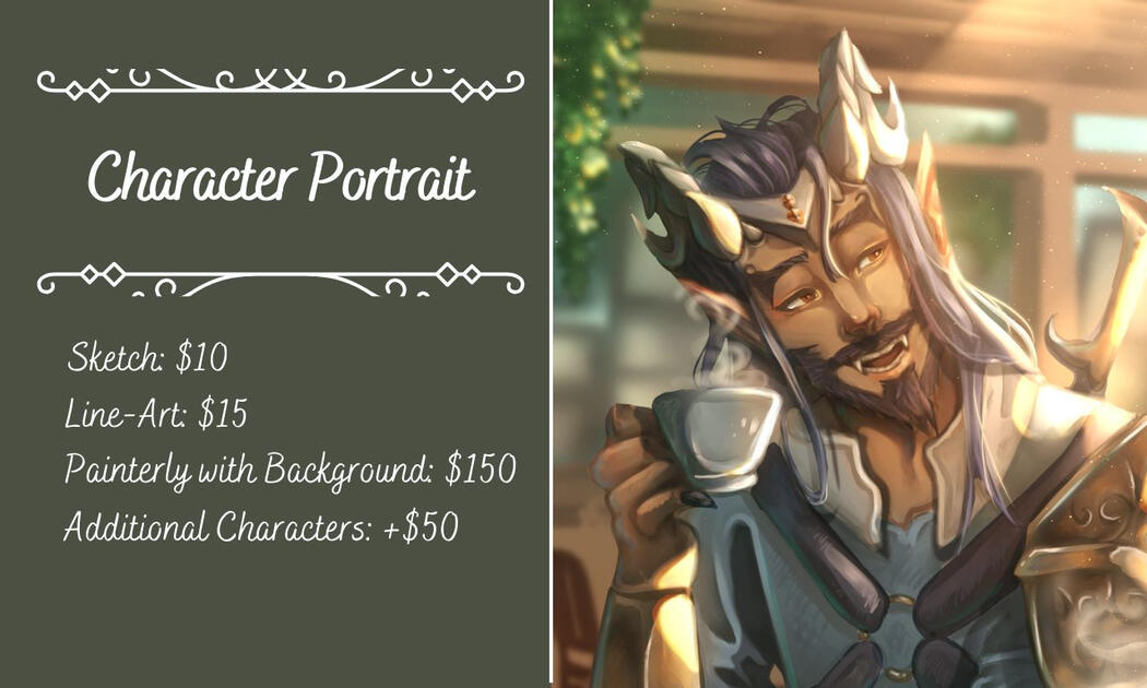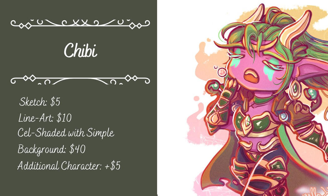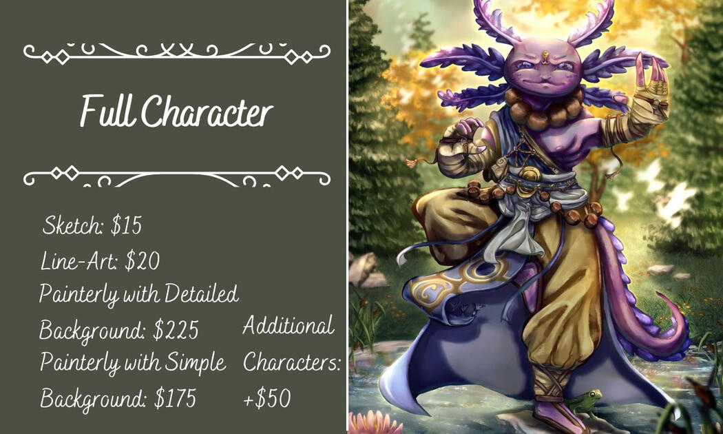Thank you for taking a look at my commissions! If you have any questions feel free to contact me with your inquiries. I'll work on your commission as fast as I can and keep you updated throughout the process. Each commission comes with 2-3 revisions if you aren't happy with the direction it's going in.Note: If you have a set budget and none of these listings fit, feel free to message me anyway! I can always adjust my process to be less complex to accommodate a budget if needed. :)I appreciate your consideration!